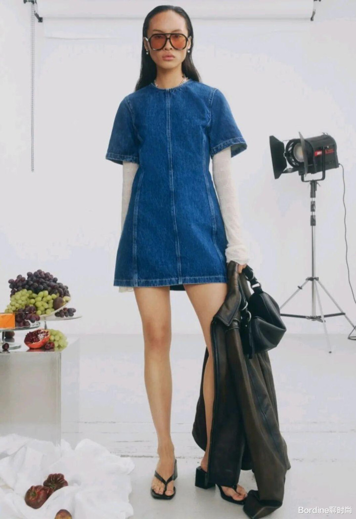 蓝色的颜色在冷色调的色调之上,以牛仔的面料增加了材质的纹理质感,以短袖的修身裙装款式,增加了优雅休闲的日常感,拼接的设计中为服装增加了一些线条的细节感;还在袖子的位置,白色的出现让裙装也增加了一些层次的休闲时尚。