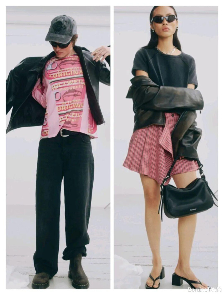粉红色的颜色在休闲的上衣、格纹裙装等服装之上,色彩的对比增加了花纹的简约活力感、格纹的经典复古也在不规则的下摆多了线条感;而这些彩色颜色在和黑色等深色颜色的搭配,则凸显了这部分的存在感。