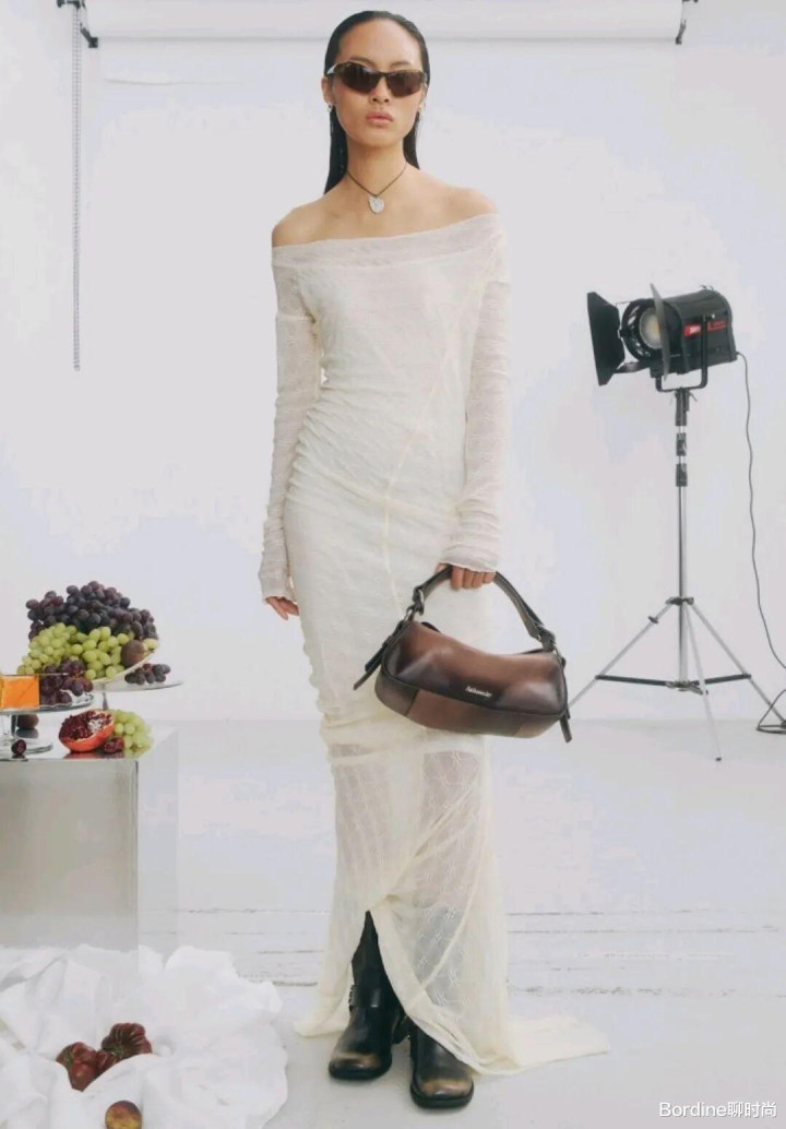 纯白色的服装在色彩的干净纯洁的气质中,以轻薄的材质在朦胧的视觉也多了一些朦胧飘逸的视觉感,在修身连衣裙上也多腰身曲线的温婉柔和感,还在不规则的下摆、一字肩和线条感等设计的结合,让纯白色的裙装也多了一些细节感。在和黑色短靴、棕色渐变包包等之间的搭配,色彩的对比也增加了一些吸睛的亮点。