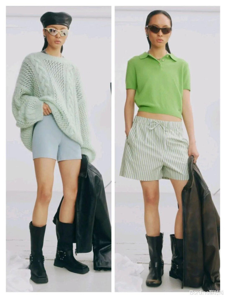 绿色系的颜色在服装上多了一些清新的清透感气质,以针织的面料增加编织的纹理,在条纹图案的简约大方中,结合了短裤款式的休闲时髦。