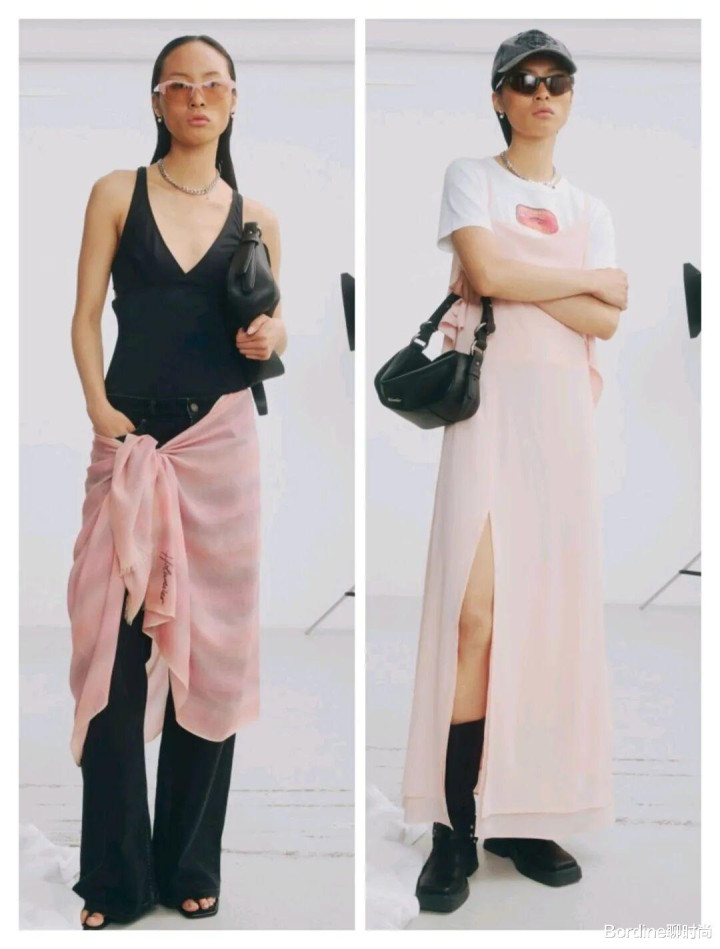浅粉色的颜色多了一些柔和粉嫩的少女感气质,以打结系带、开叉等设计让裙摆的位置有着不少细节的设计特色;粉色的裙装和黑色的直筒裤、黑色的背心、白色的T恤等服装的搭配,色彩丰富也多了对比的层次感。