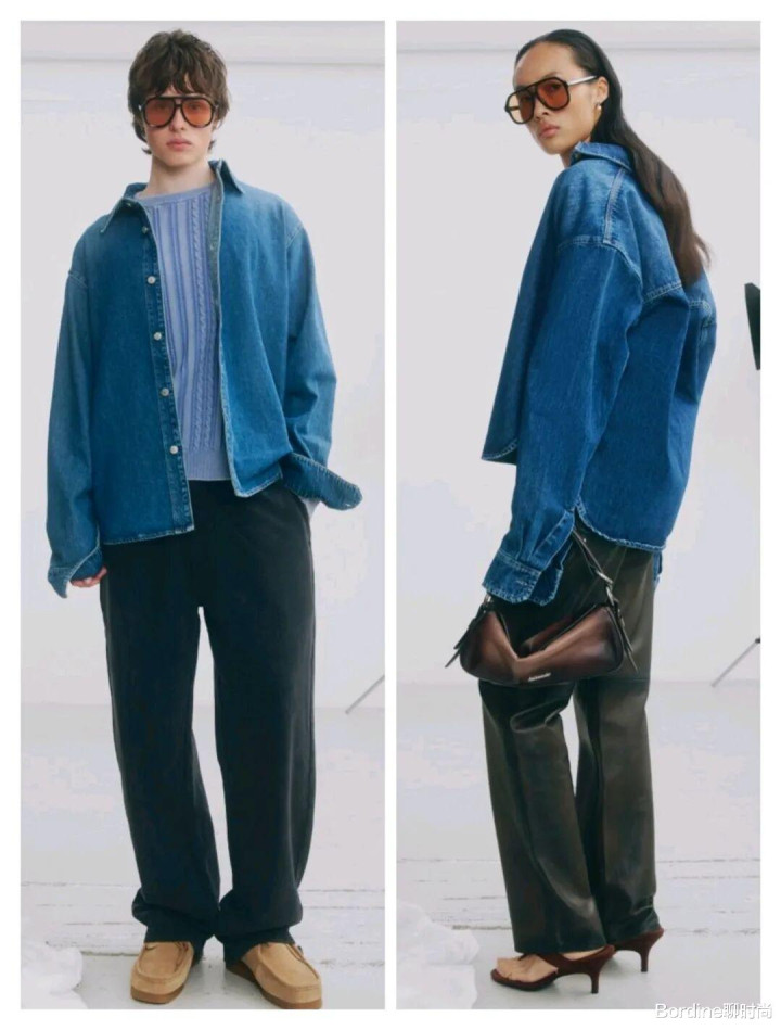 浅蓝色的颜色在纯色的简约中还多了清新的气质感,在面料的纹理质感中,以宽松的线条增加了直线的利落感,这些浅蓝色的服装和黑色等深色颜色的结合搭配,则带来了更为强烈的撞色冲击感。